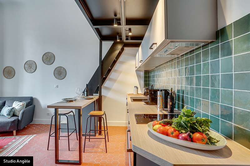 Provencal floor tiles and soft wall colours associate with the metal mezzanines in the spirit of ‘Southern Loft living’.